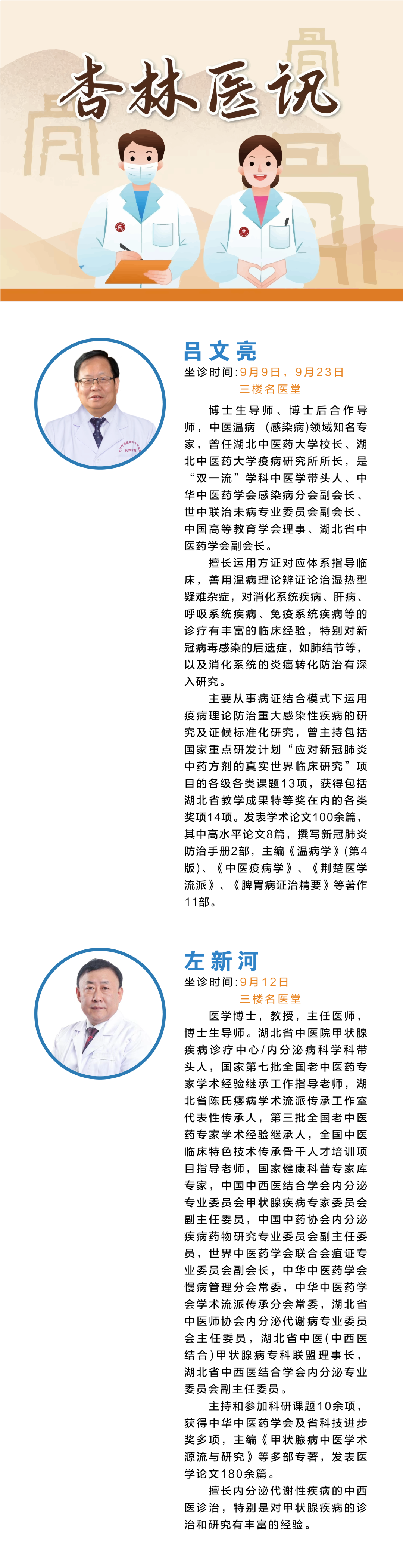 『杏林医讯』吕文亮教授9月9日,左新河教授9月12日来院坐诊