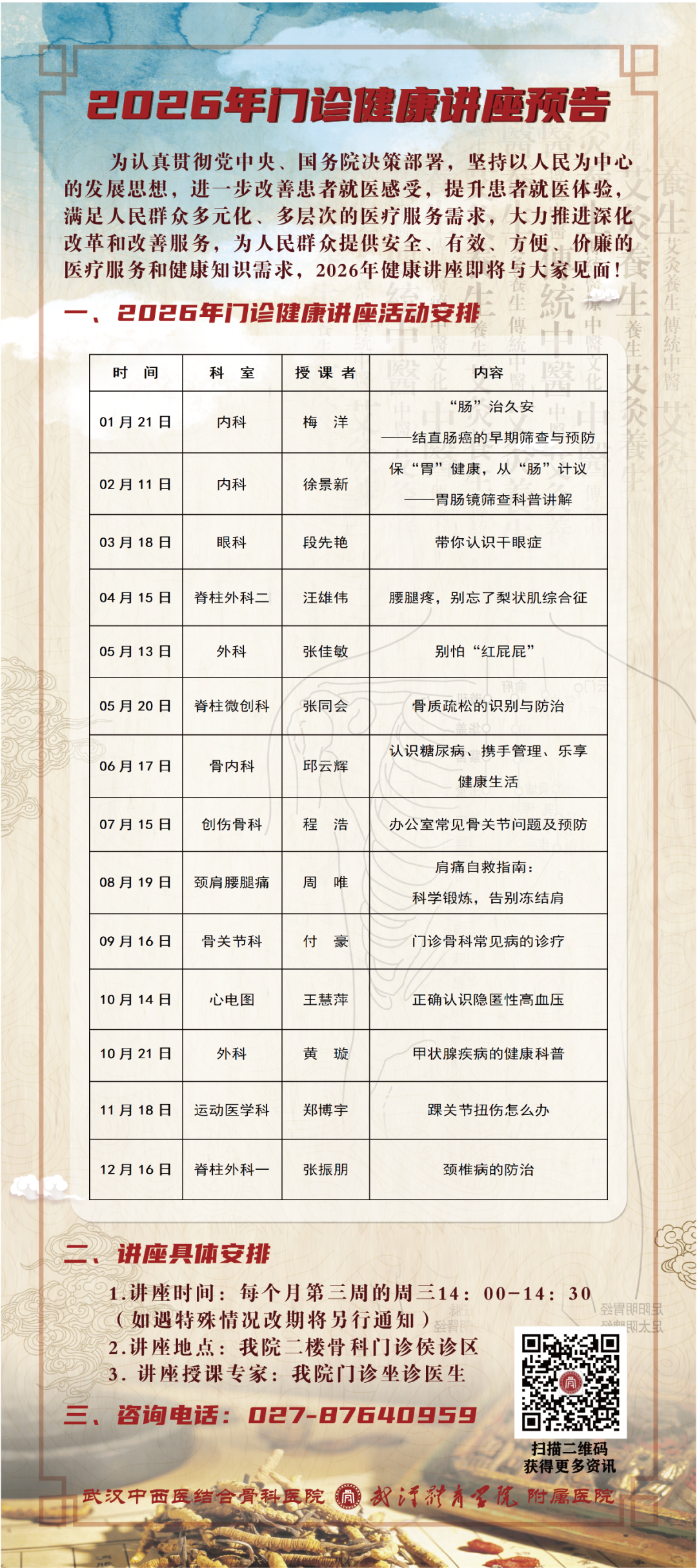 2026 年武汉中西医结合骨科医院(武汉体育学院附属医院)门诊健康讲座已安排!从肠胃养护、眼症识别,到骨质疏松、颈椎病防治,每月第三周的周三 14:00-14:30,二楼骨科门诊候诊区,门诊坐诊专家带你解锁实用健康知识~