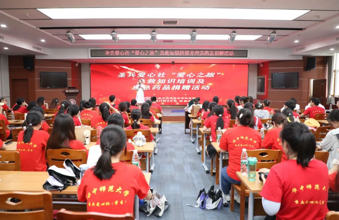 常见急救技能的培训、心肺复苏的实际操练,7月12日下午,我院对华中师范大学“圣兵爱心社”爱心之旅的应急药品捐赠仪式及急救知识培训活动在17楼顺利进行。本次授课以及药品捐赠对于他们即将到来的走访活动具有重要意义。